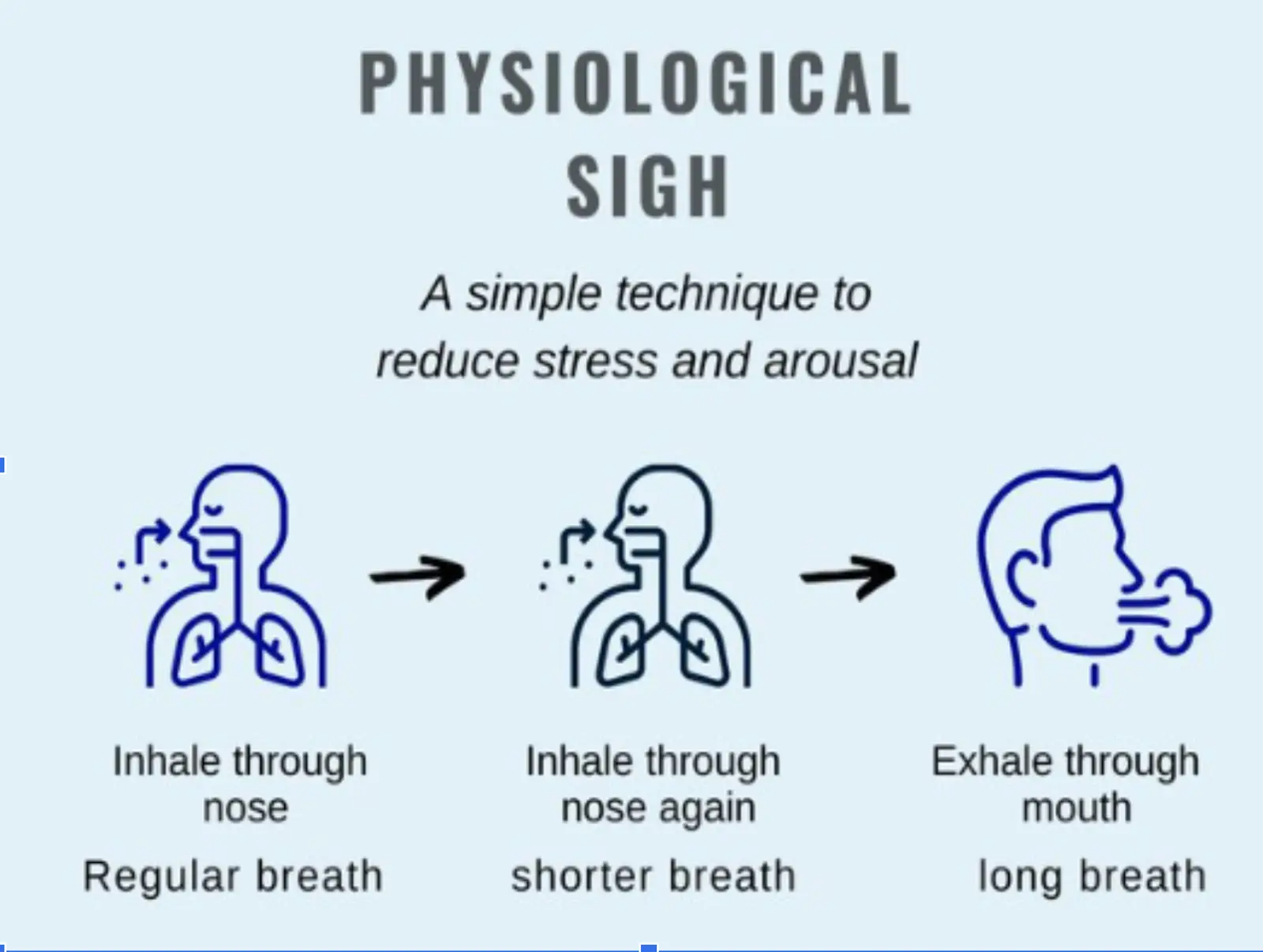 The Double Inhale (The CO2 Dump): When stressed, the tiny air sacs in your lungs (alveoli) collapse, trapping carbon dioxide and triggering panic signals. A deep nasal inhale followed by a sharp second "top-off" inhale mechanically pops those alveoli open, dumping the toxic $CO_{2}$.