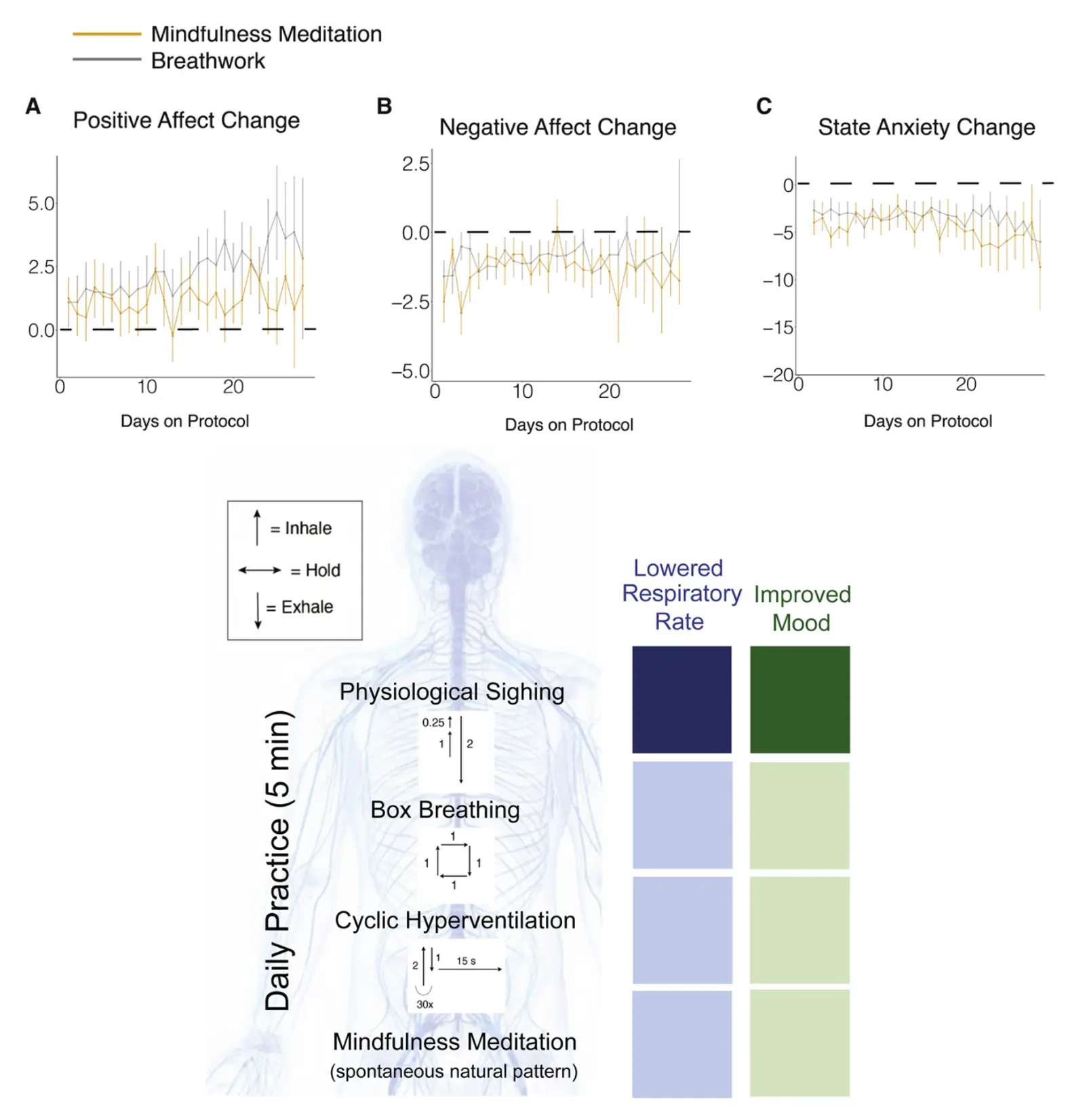 The Long Exhale (The Vagal Brake): Exhaling through the mouth for longer than your inhale physically stimulates the vagus nerve. This directly signals the heart's pacemaker to slow down, dropping your heart rate in real-time.