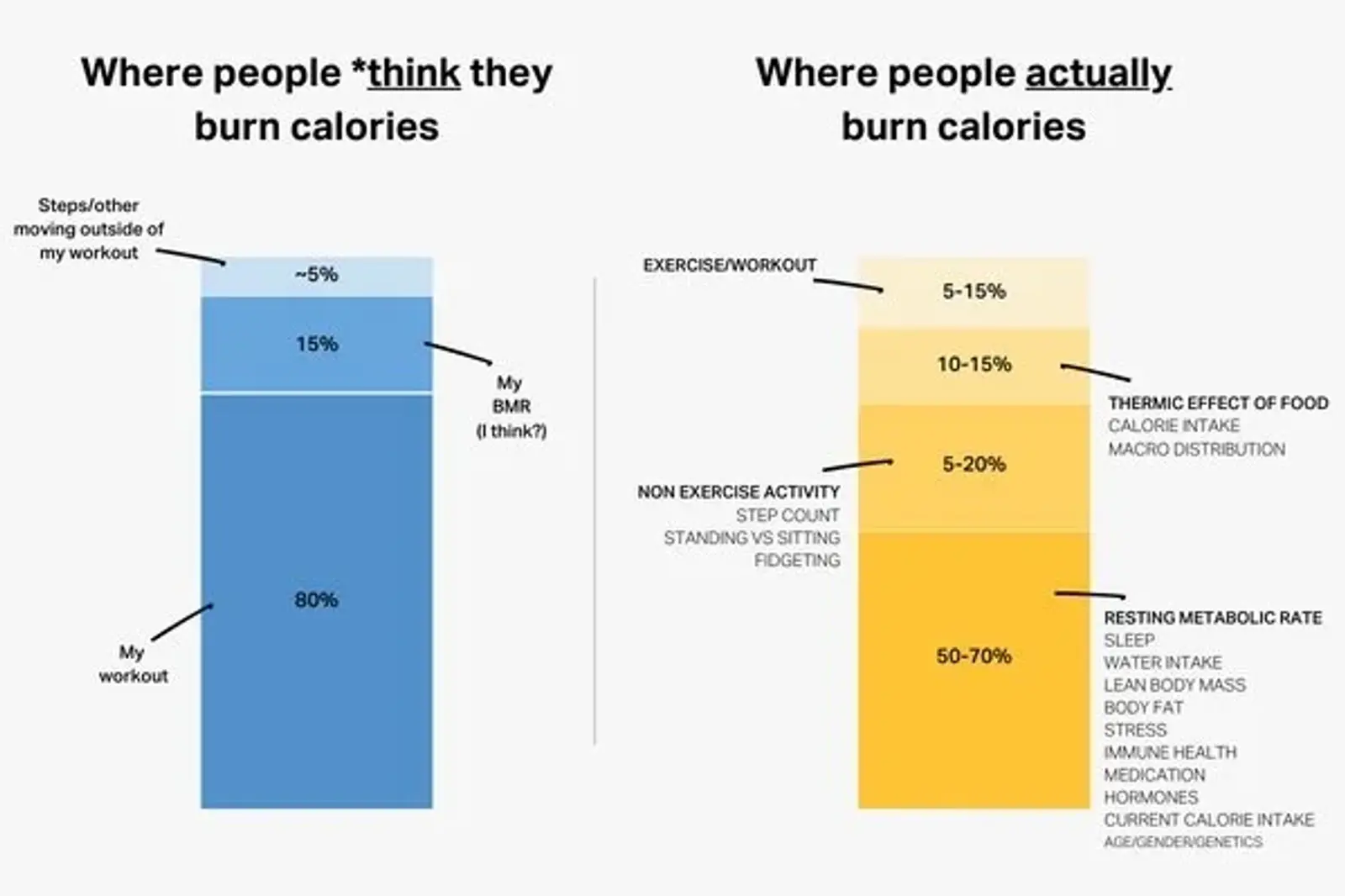 The Metabolic Engine: Your Total Daily Energy Expenditure (TDEE) determines your maintenance calories. Roughly 70% of this is simply your Basal Metabolic Rate (BMR)—the energy burned just keeping organs alive. Exercise burns far fewer calories than people assume; strict diet control is the true driver of the deficit.