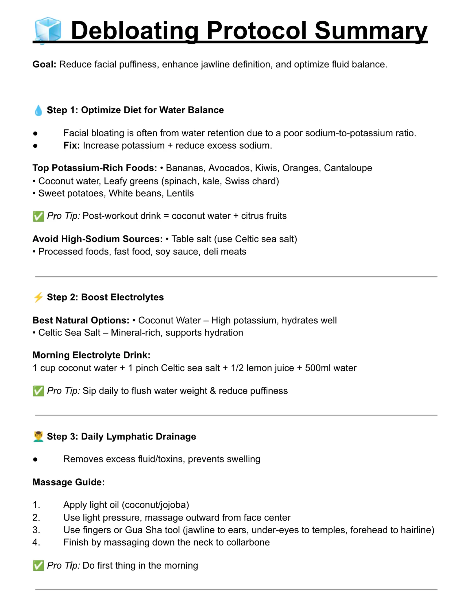 The Sodium/Potassium Ratio: Facial bloat is usually interstitial fluid retention driven by osmotic imbalances and gravity. High sodium intake raises your osmotic load, causing your body to pull and trap water into soft tissues like the midface to maintain balance. To actively flush the trapped water, you must consume Potassium, which chemically signals the kidneys to excrete excess sodium through urine. Aim for 3,500–5,000 mg of potassium daily via foods like avocados, spinach, and sweet potatoes. Limit Sodium to 1500-2300mg.