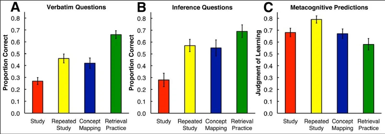 Long-Term Durability: While re-reading fades quickly (the "Forgetting Curve"), retrieval practice flattens the curve