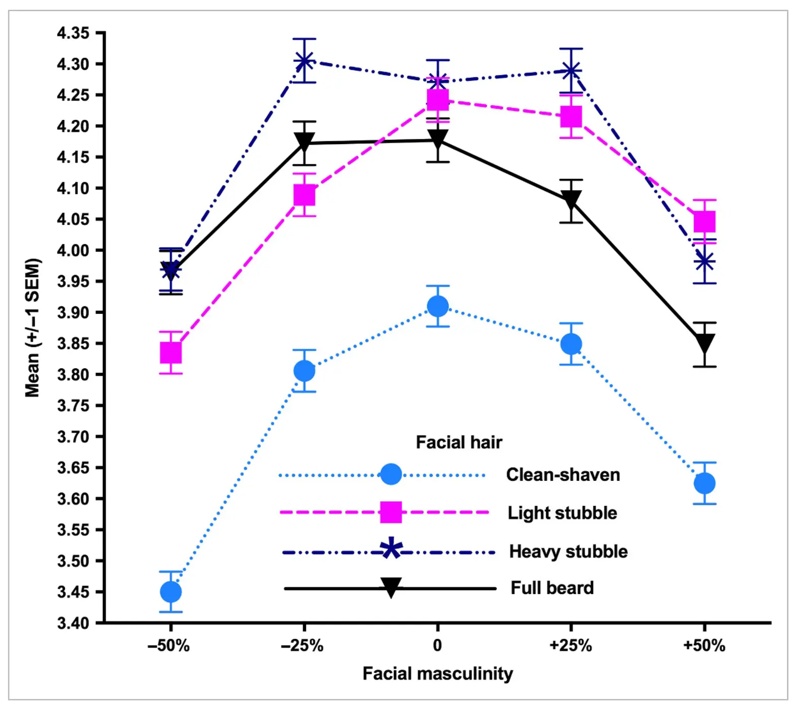 The Attractiveness Peak: Across varying levels of facial masculinity, "Light Stubble" and "Heavy Stubble" consistently rank as the most attractive facial hair styles overall. Clinical surveys show stubble dominates in both short-term and long-term relationship desirability, outperforming completely clean-shaven faces and full beards.