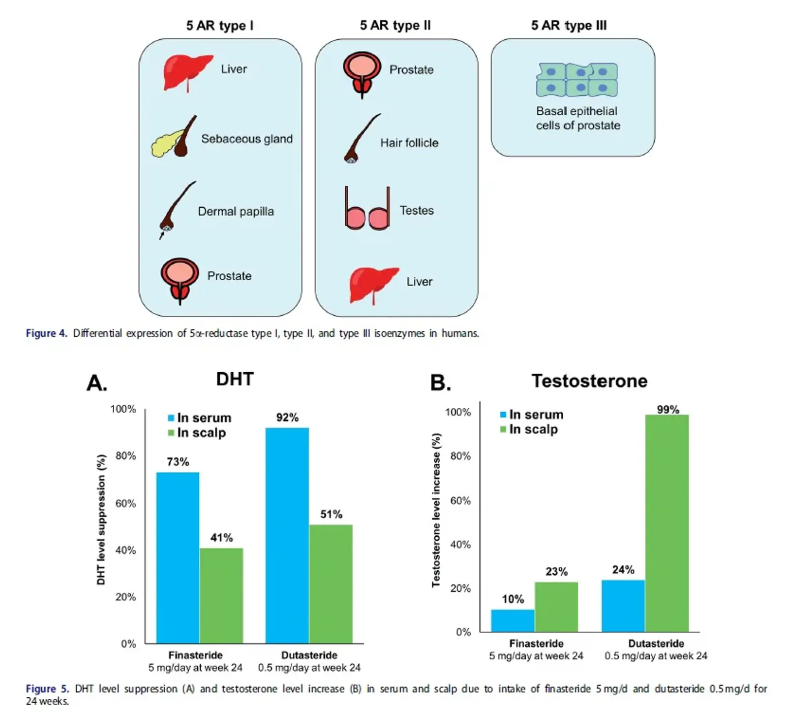 Finasteride: Inhibits Type II 5-AR. Reduces Serum DHT by ~73% and Scalp DHT by ~41%. It has a short half-life (~6 hours).