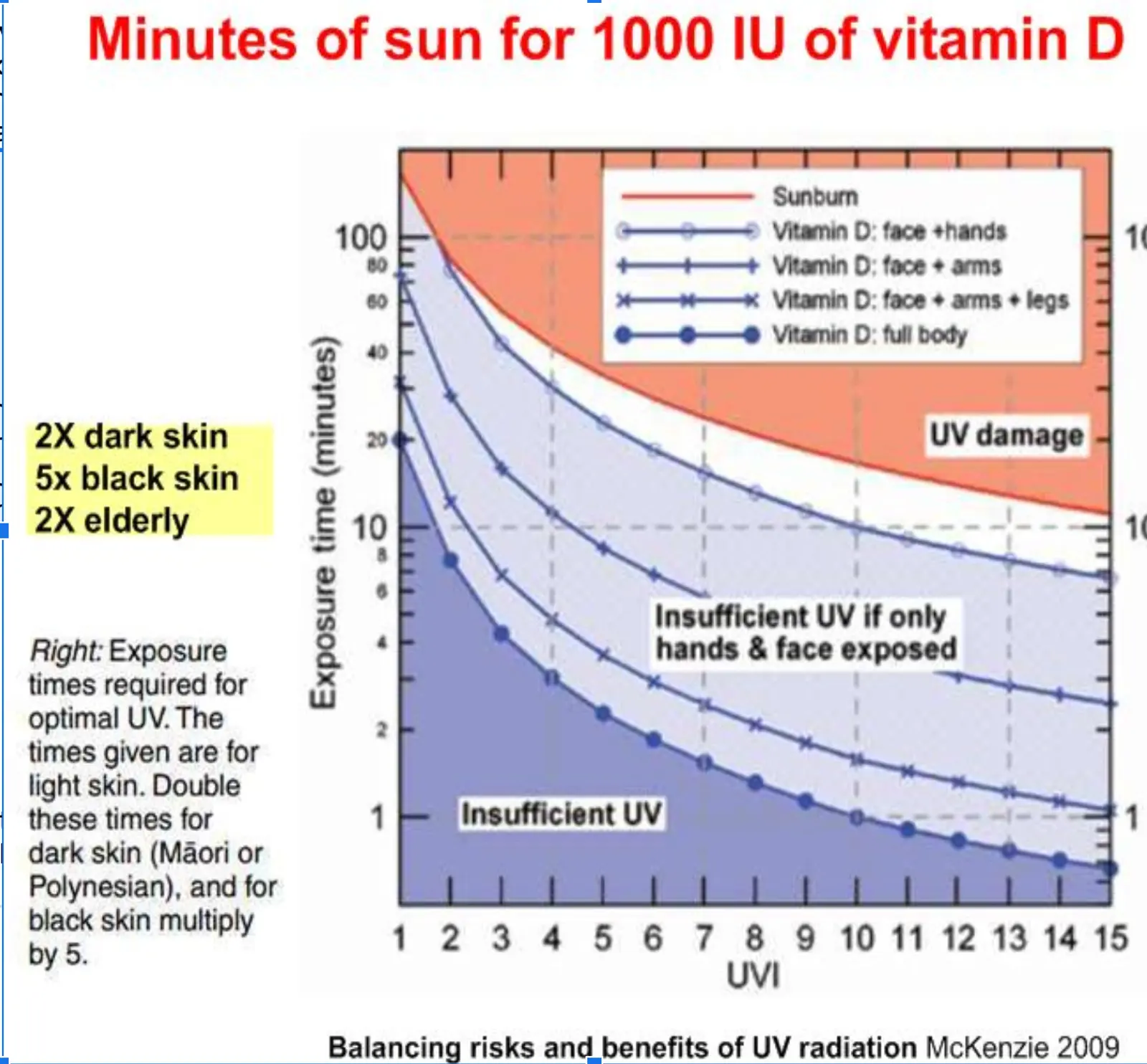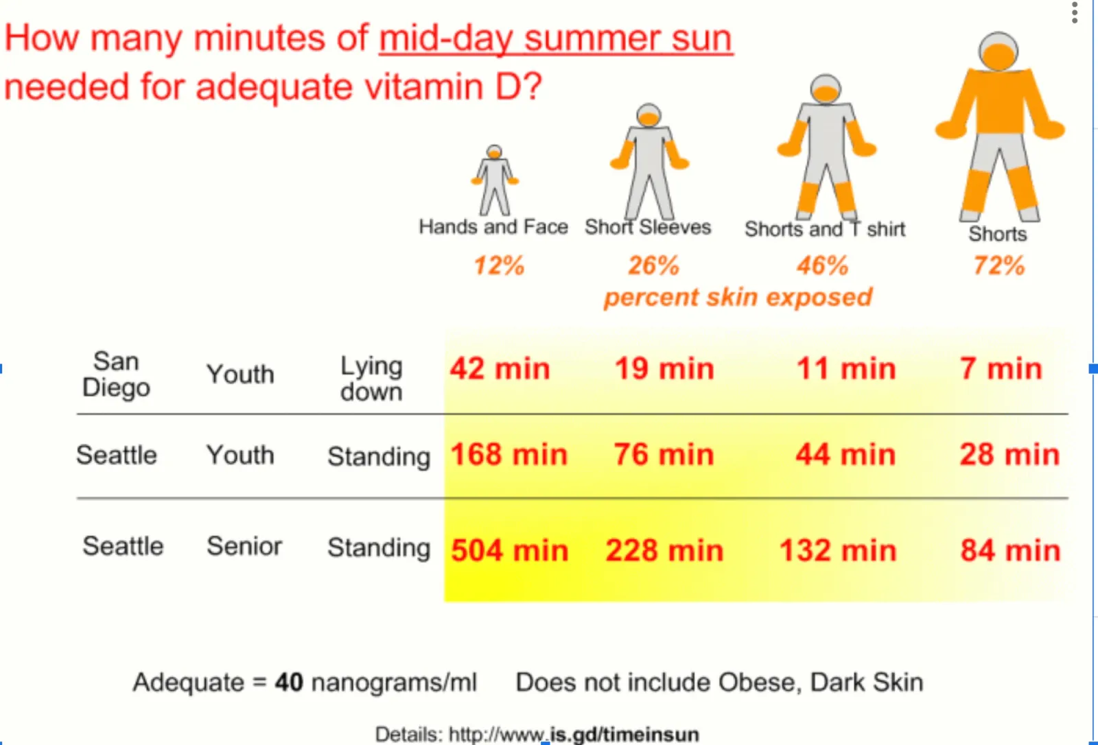Expose 60%+ of skin (torso/legs) for 10–20 mins at Solar Noon; keep face shaded.